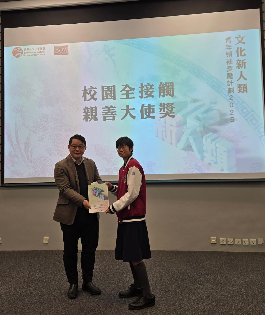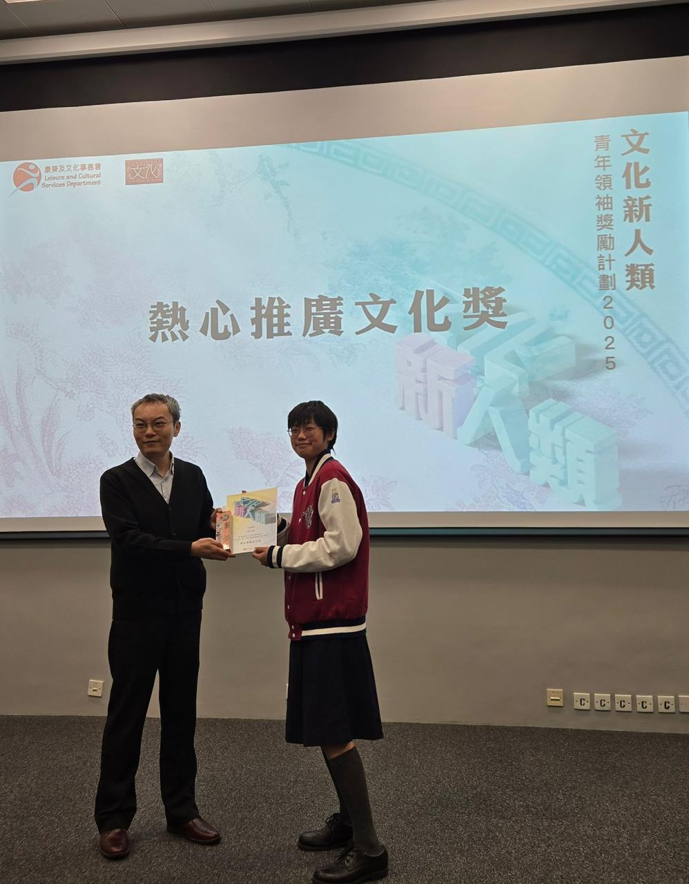 近日,她出席該計劃的分享會暨頒獎典禮,獲得「熱心推廣文化獎」、「校園全接觸親善大使獎」兩個獎項。恭喜尹同學,祝願她未來更積極參與文化活動,推廣本土文化。